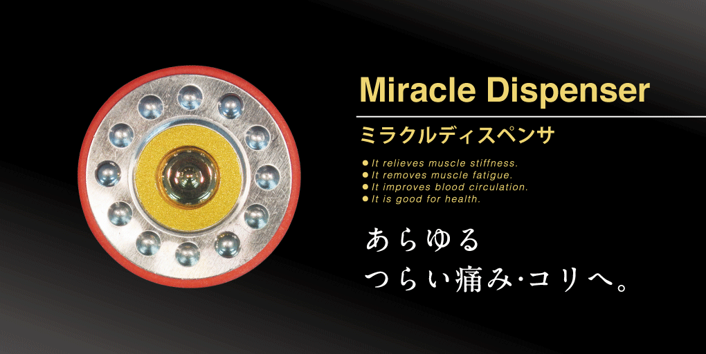 本器は一個あたりのサイズを最大の直径2.8cmにし、本格的な痛み・つらさ・コリに対応できるよう開発しました。長年かかって硬くなってしまった筋肉をその場ですぐにゆるくする、ズキズキするつらさを消していく。鍼灸をヒントに、試行錯誤を重ね生まれたのがミラクルディスペンサです。痛みはつらければつらいほど身体に負担がかかり面積は広がっていきます。本器は直径2.8cmのサイズをたくさん敷き詰めて貼っていくことで、その広い患部をカバーし筋肉をゆるめていきます。