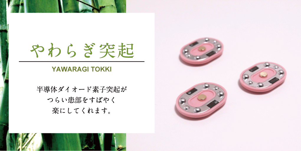 本器は2本の半導体ダイオード素子を「筒状突起」として組み込みました。この電子部品は電流を整流する機能を持っており、今までにないハイパワーで、色々な使い方に対応できるようになりました。従来の、痛い・つらい箇所に器具を集中的に貼っていく方法はもちろん、症状に合ったツボに貼っていく方法。また、経絡を使った方法も非常におすすめです。私たちは症状ごとに対応した計8箇所の経穴を推奨しています。本器購入の際に付属する解読書に、貼る箇所を掲載していますので、本格的ながら誰でも簡単にツボ・経絡療法を行えます。