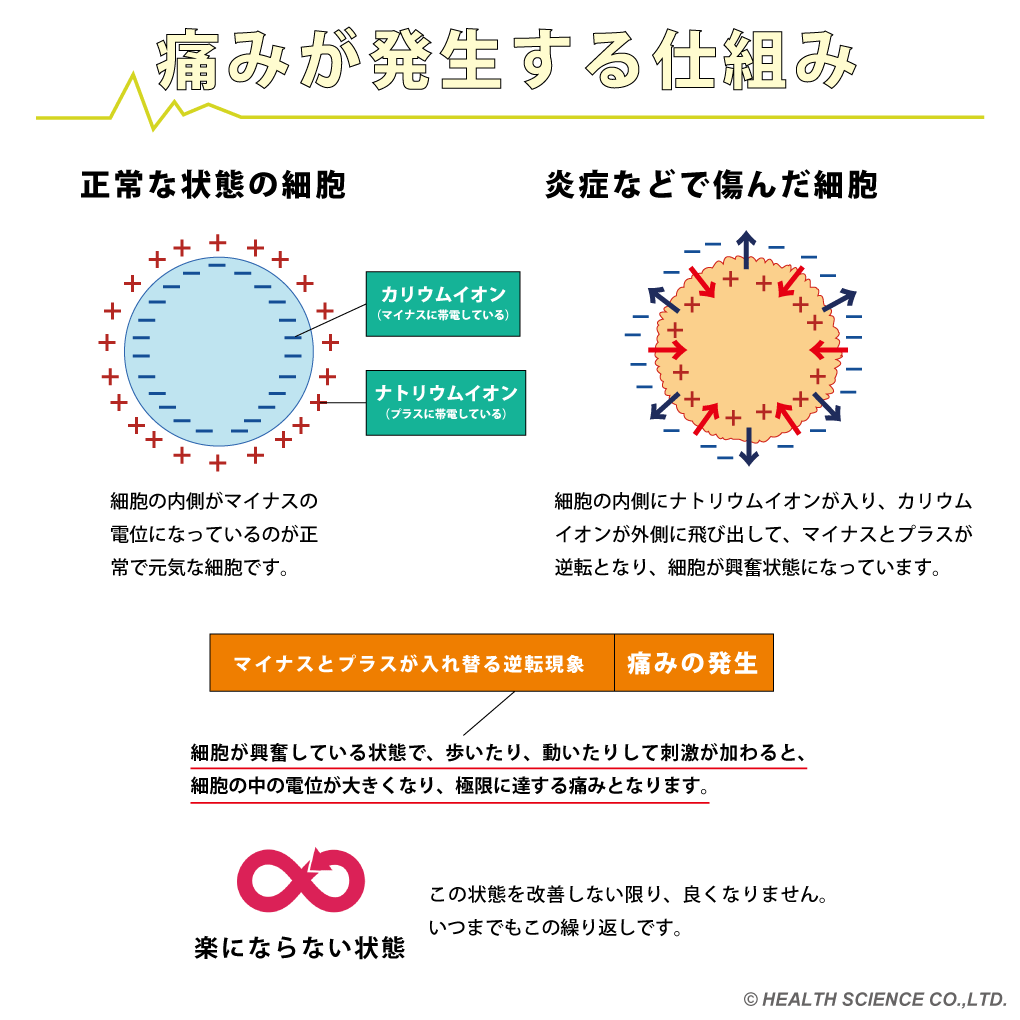 たとえば膝の場合、滑膜の炎症などにより細胞が傷ついたり、刺激を受けて細胞の電位が逆転(膜の興奮)すると、当然細胞膜の内外に大きな電位差が発生します。膝が痛いというのは、膝の筋肉や滑膜に炎症があり、炎症によって細胞が興奮状態にあるということです。細胞の内側と外側にプラス電位とマイナス電位の逆転した状態があり、そのような状態の時に、歩いたり動いたりして刺激が最大になって痛みを発生させているのです。