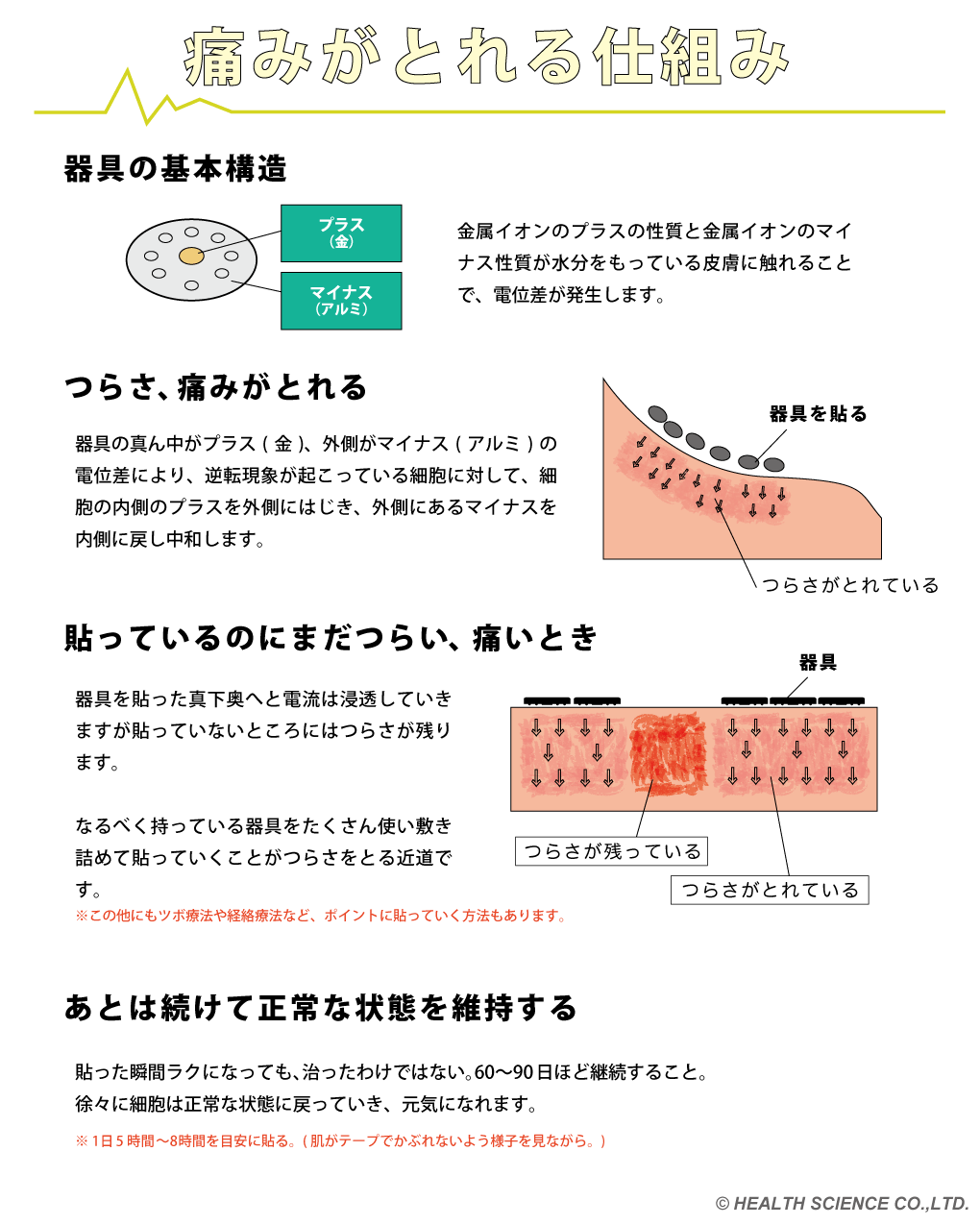 この器具を貼って痛みが取れないという時は、細胞の興奮状態が広い範囲にわたっていて、わずかな数個の器具ではカバーしきれていないということです。痛みが発生している患部とその周辺を、指で丹念に押してみて「圧痛点(押すと痛いと感じるポイント)」をたくさん探し出して、そこにはこの器具を貼るということが必要になります。数多く貼ることで、細胞の興奮は抑えられ痛みは消えることになります。